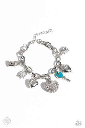 An assortment of charms, including silver hearts, pronged white gems, a turquoise-painted key and silver lock, and rhinestone-embellished thick heart dangle from a silver paperclip chain for a carefree finish around the wrist. Features an adjustable clasp closure.
