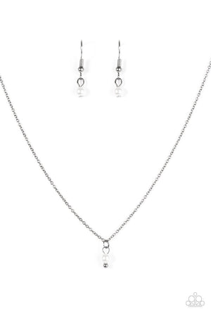 A dainty white pearl swings from the bottom of a shimmery gunmetal chain, creating a timeless pendant below the collar. Features an adjustable clasp closure.
