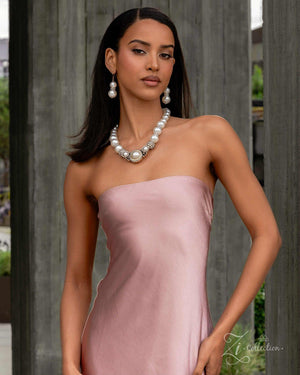 A decadent arrangement of oversized, timeless white pearls, gold ornaments adorned in white rhinestones, white rhinestone-encrusted gold rings, curls of gold dotted with white rhinestones on their ends, and white pearls in varying sizes pressed in white rhinestone frames delicately adorn the neckline along an invisible wire for a luxuriously luminous look. Features an adjustable clasp closure.