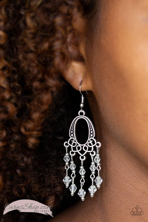 Glassy white beads cascade from the bottom of an ornate silver frame, creating a whimsical chandelier. Earring attaches to a standard fishhook fitting.