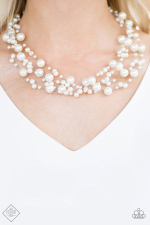Timeless white pearls in a variety of sizes are threaded along twisting silver wire, creating floating layers below the collar. Features an adjustable clasp closure. Includes one pair of matching earrings.