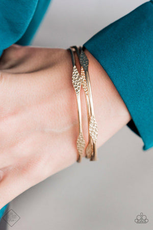 Delicately hammered in sections of shimmer, glistening gold bangles stack across the wrist in a glamorous industrial fashion. Set of three bracelets.