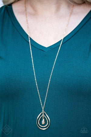 Delicately hammered, two glistening gold teardrops swing from the bottom of a shimmery gold chain. A golden crystal-like bead dangles in the center of the teardrop pendants as the largest frame is encrusted in dazzling white rhinestones for a radiant finish. Features an adjustable clasp closure. Includes a set of matching earrings.