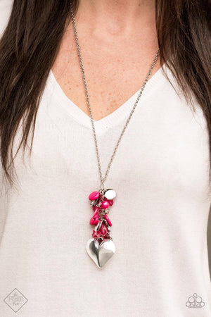 Infused with an array of pink beads, a collection of antiqued silver shell and butterfly charms trickle along the bottom of a shimmery silver chain. Complemented with a glittery white rhinestone encrusted bead, a dramatically oversized silver heart pendant swings from the bottom of the clustered tassel for a whimsical finish. Features an adjustable clasp closure.