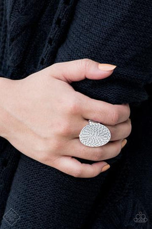 Radiating with hammered detail, an antiqued silver hoop curls around the ear for an artisan inspired look. Earring attaches to a standard post fitting. Hoop measures 2" in diameter.