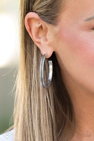 Embossed in tribal inspired details, a glistening silver hoop curls around the ear for a seasonal look. Earring attaches to a standard post fitting. Hoop measures 1 3/4" in diameter.