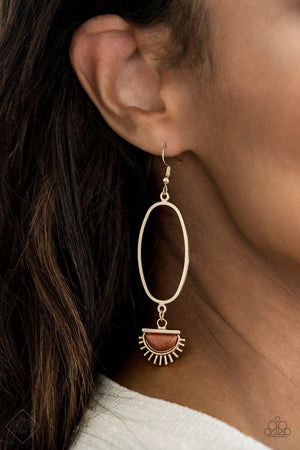 A golden sunburst charm with a goldstone center dangles from the bottom of an elongated oval hoop for a trendy vibe. Earring attaches to a standard fishhook fitting.