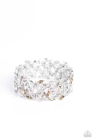 Round white gems and marquise-cut light topaz gems intertwine around polished silver studs and ornate feather-like details in a glitzy pattern. The textured, glittery display is threaded along elastic stretchy bands for a whimsical finish.
