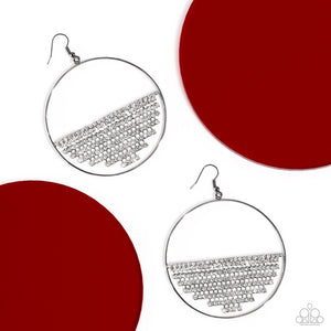 A curtain of white rhinestones is stretched between the edges of a skinny, oversized gunmetal hoop, creating a shimmering display. The rhinestones taper towards the center as they sway and cascade, adding sparkly movement for a fierce industrial finish. Earring attaches to a standard fishhook fitting.