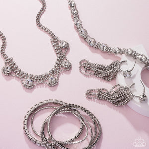 Threaded along invisible stretchy bands, a collection of silver bracelets featuring rows of sparkling white rhinestones stack along the wrist. The luxurious design adds a dazzling and elegant touch to any look.