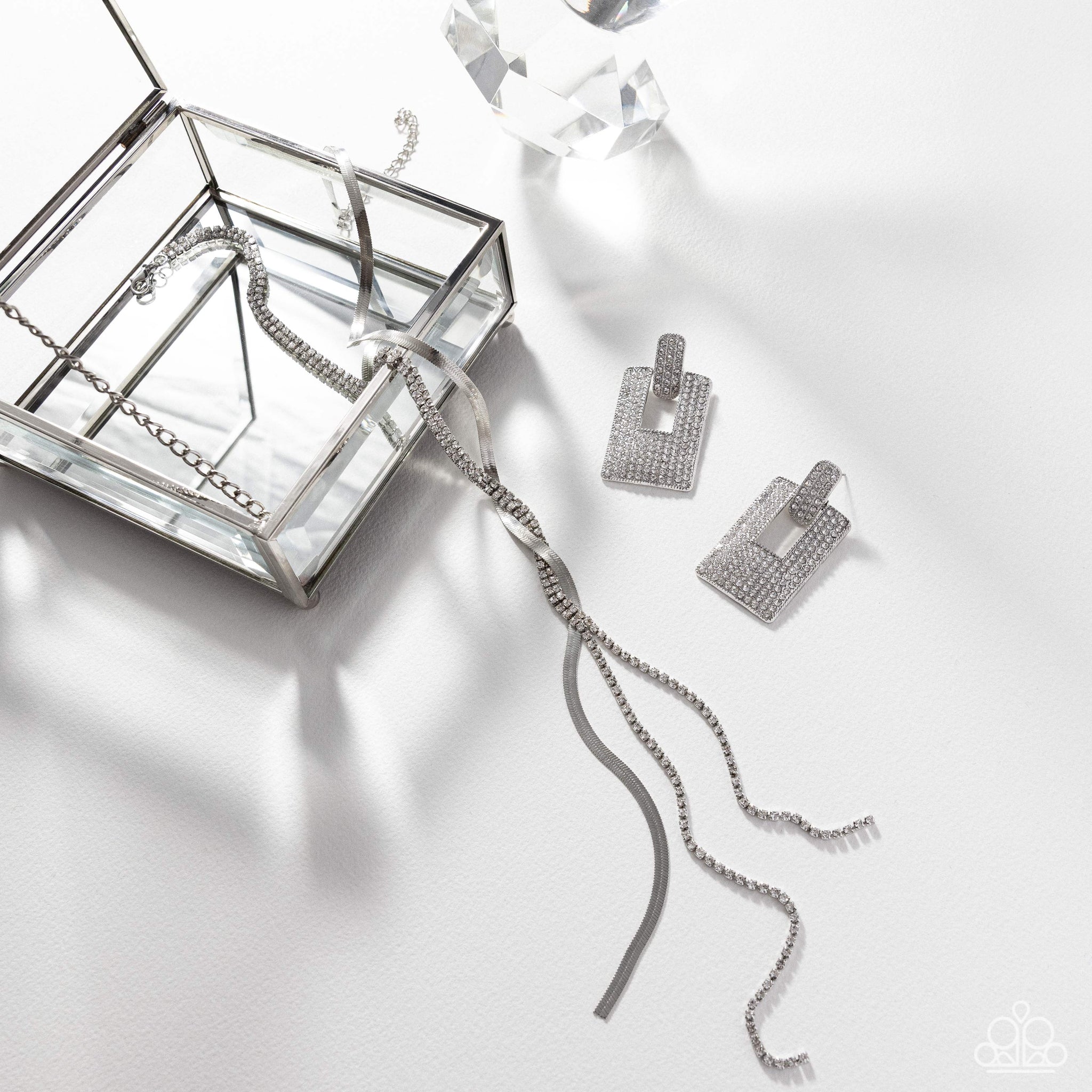 Emanating from an oval clasp, three dazzling rows of white rhinestones help guide the eye to an elongated, swaying, silver square embellished head-to-toe in dainty rhinestone sparkle for an adorably assertive lure. Earring attaches to a standard post fitting.