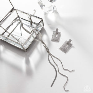 Pressed in silver square fittings, dual strands of glassy white rhinestones loop around the neck beside a silvery herringbone chain ribbon, delicately splitting into an icy tassel below the chest. Features an adjustable clasp closure.
