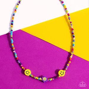Multicolored seed beads, featuring lavender, green, pink, pearly pink, blue, orange, purple, yellow, and dark green, are threaded along a wire, falling along the collar in a capricious pattern. Bringing additional charm to the design, yellow smiley face beads, and a purple flower with a yellow smiley face center, blooms amongst the bright pops of color. Features an adjustable clasp closure.