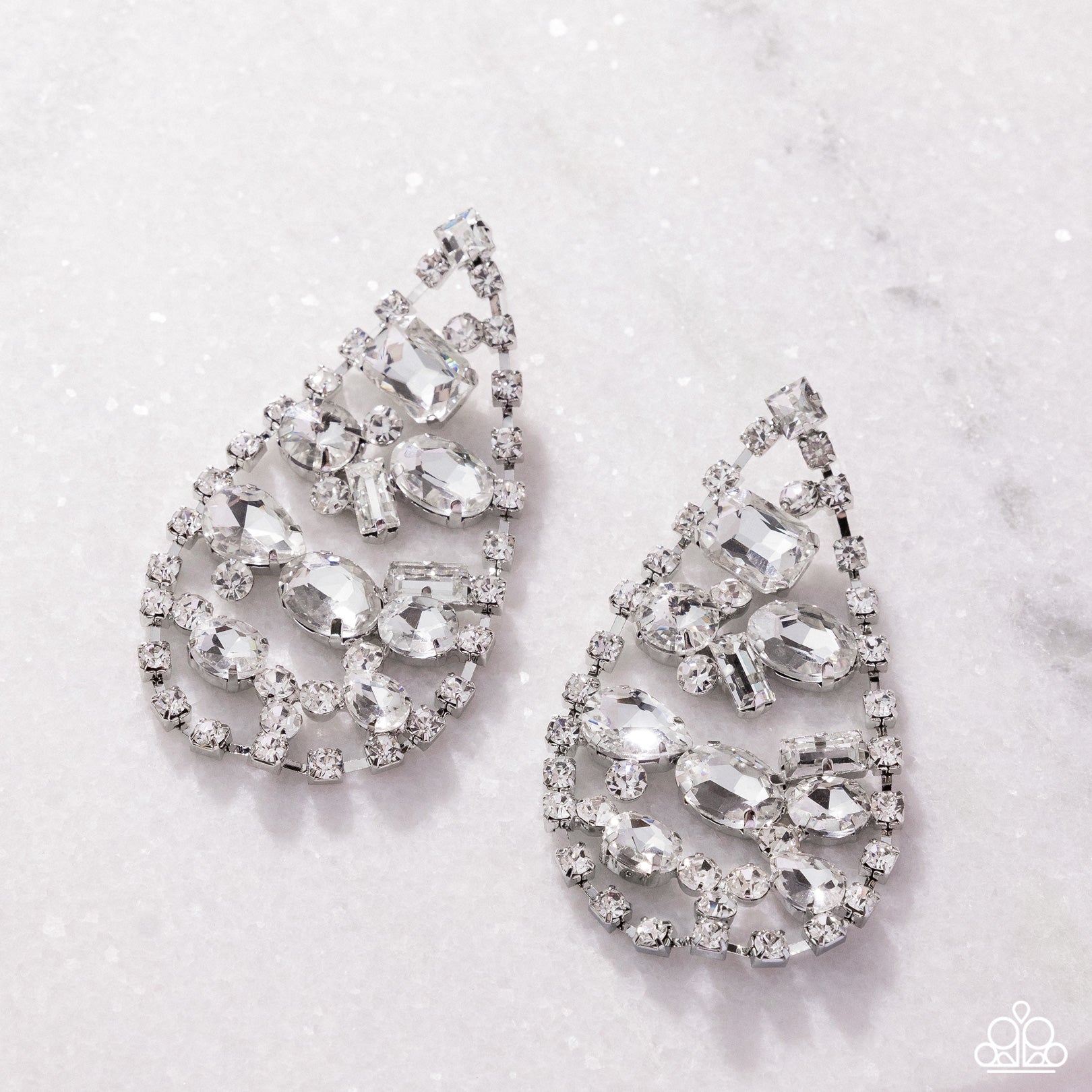 Sparkling white rhinestones are arranged in intricate patterns along teardrop-shaped silver frames, creating a dazzling chandelier-like design. The teardrop, round, oval, and emerald cuts add to the sparkling theme. Earring attaches to a standard post fitting.