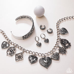 Featuring an array of whimsical and romantically curly filigree patterns, a collection of silver hearts and ornate silver charms, some with white rhinestone detailing, swing from the bottom of a shimmery silver cable chain, creating a vintage-inspired fringe below the collar. Features an adjustable clasp closure.