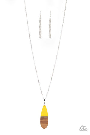 Dipped in a sunny yellow finish, a wooden teardrop pendant swings from the bottom of a lengthened silver chain for a colorful earthy look. Features an adjustable clasp closure.