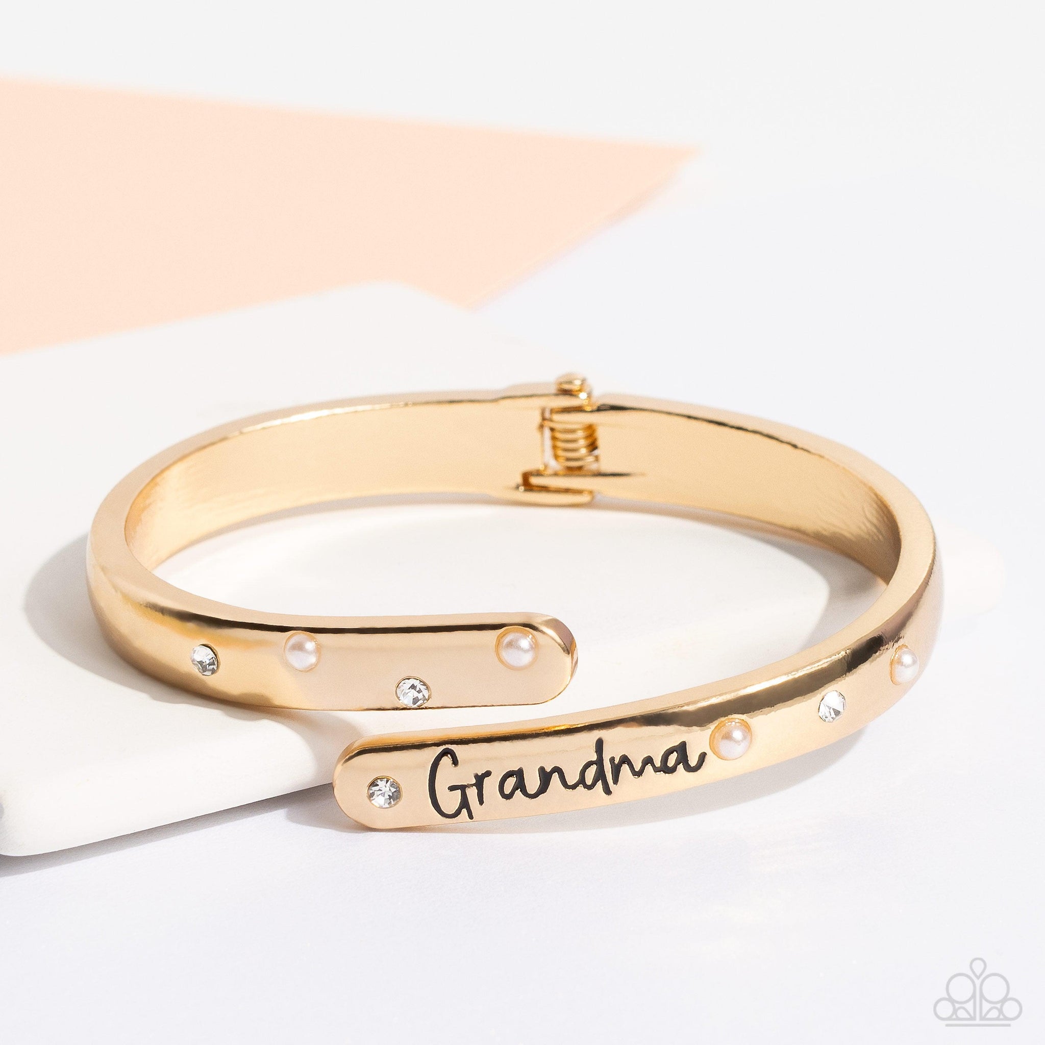 High-sheen gold curves into a hinged closure around the wrist. Featured on the upper curve, dainty pearls and white rhinestones alternate in a zig-zag pattern for a refined shimmer. The lower curve of gold features the stamped word "Grandma" in a curly font with rhinestones and pearls bordering the word for additional elegance. Features a hinged closure.