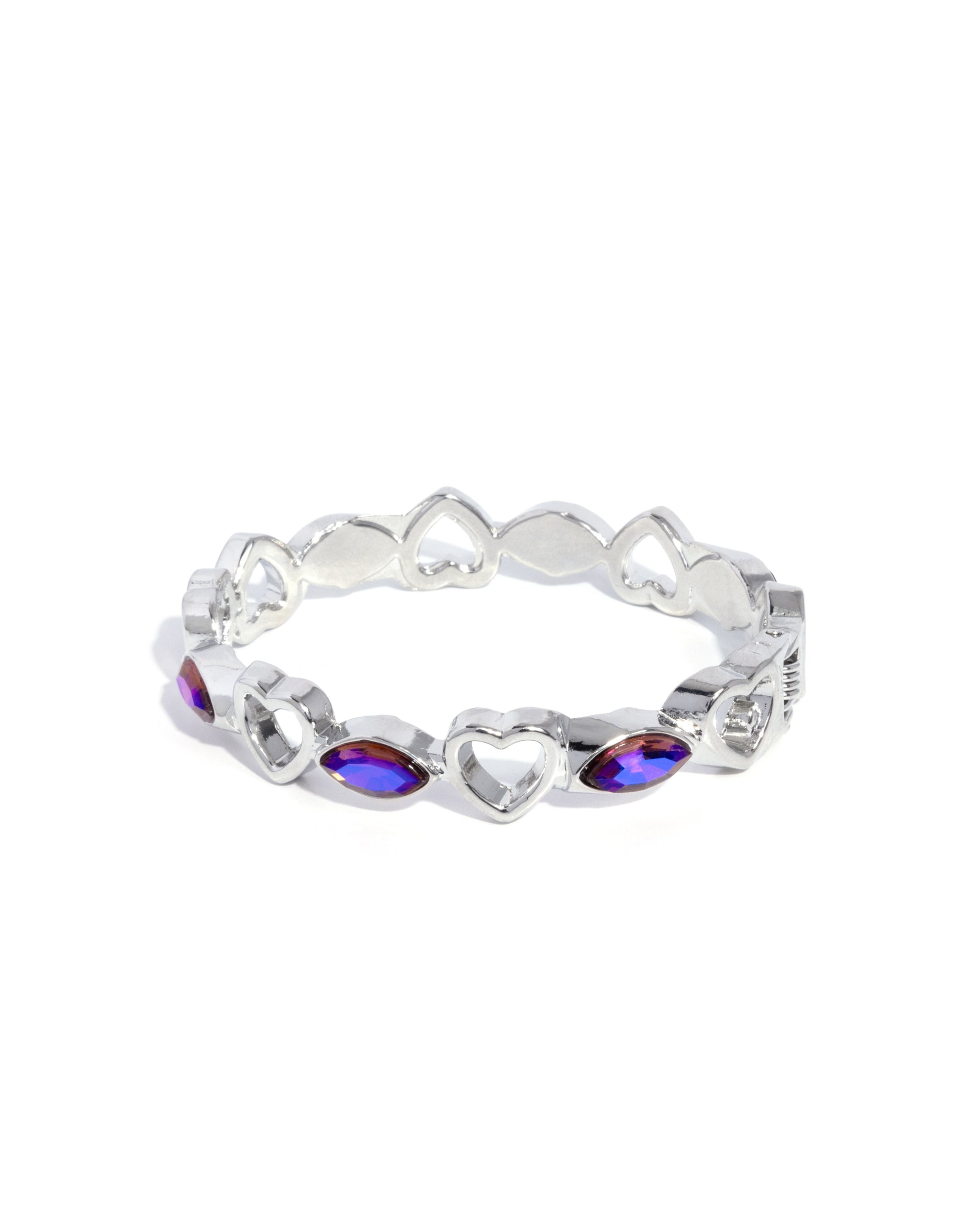 Featuring a high-sheen finish, alternating open-heart frames and purple iridescent marquise-cut gems wrap around the wrist. Features a hinge closure.