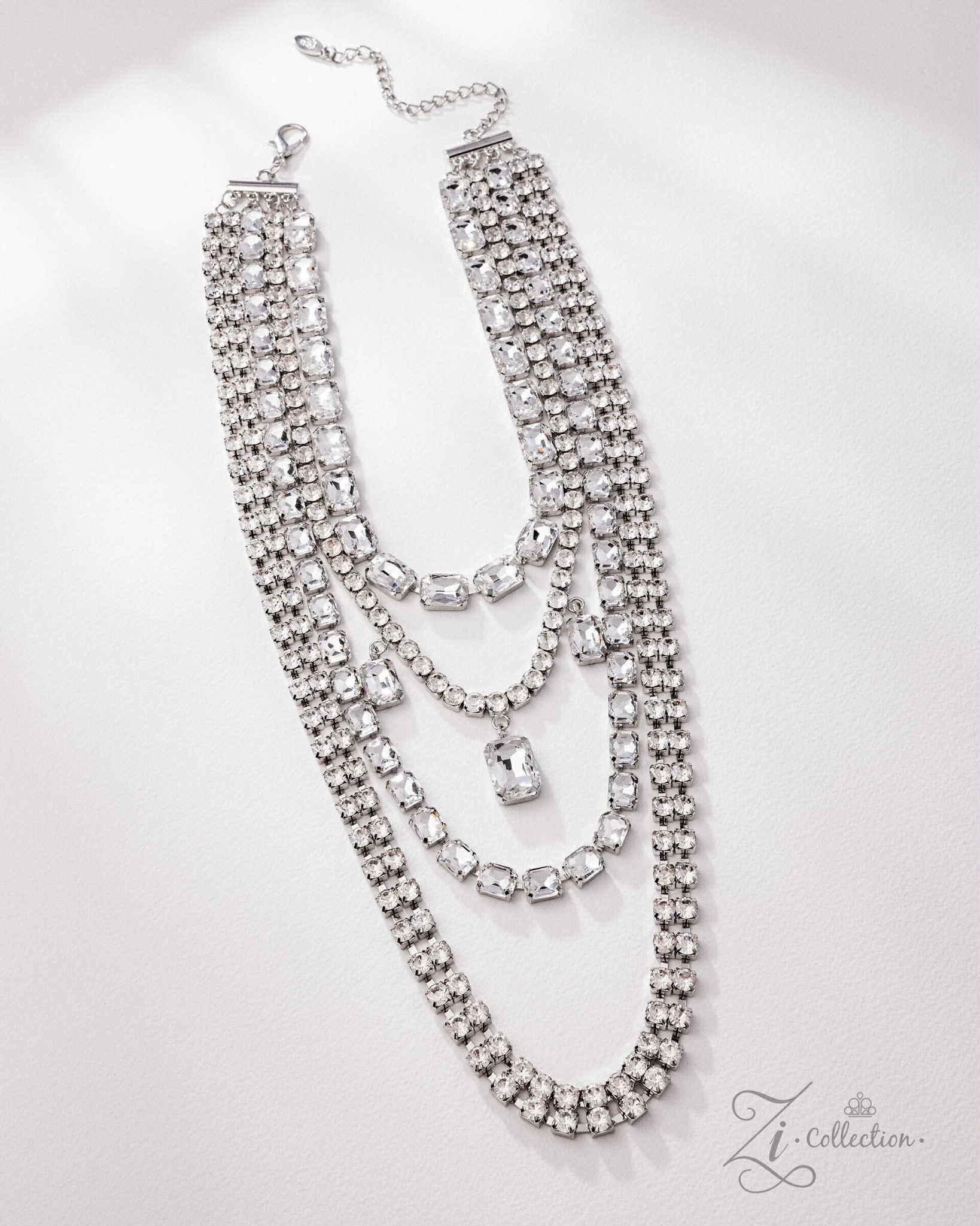 A chaotic collision of oversized emerald-cut gems and glistening rhinestone chains fearlessly cascades down the chest, creating an unapologetically industrial shimmer. Dripping in faceted brilliance, the bold array of jagged sparkle layers into a fearless fringe of grit and glam. From the center strand, a trio of solitaire emerald-cut gems sways with every step, amplifying the drama with an audible shimmer that refuses to be ignored. Features an adjustable clasp closure.