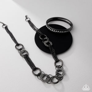 Featuring a gunmetal finish, a collection of thick, sleek rings alternating with rows of white rhinestone-embellished rings patterns around the neckline for an elegantly edgy display. Strands of copious gunmetal chains and duos of gunmetal clasp rings are sporadically infused along the design for additional dominant detail. Features an adjustable clasp closure.