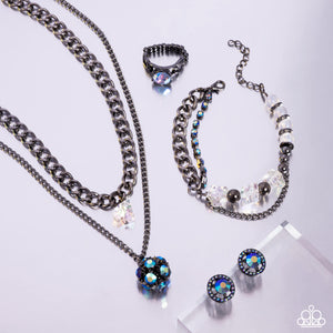 A mismatched curb and classic gunmetal chain layer down the chest. A chiseled, see-through, iridescent acrylic bead dangles from the bottom of the uppermost chain, while a sparkly blue UV rhinestone-encrusted gunmetal ornament swings from the lowermost chain for a galactic finish. Features an adjustable clasp closure. Due to its prismatic palette, color may vary.