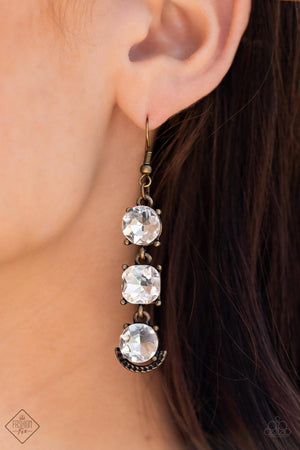 A trio of bold white rhinestones, set in pronged antiqued brass fittings, stack one above the other. The center rhinestone is almost imperceptibly square rather than round and the final rhinestone is accented with a gritty metallic crescent etched with ropelike texture, creating a ruggedly glamorous lure. Earring attaches to a standard fishhook fitting.
