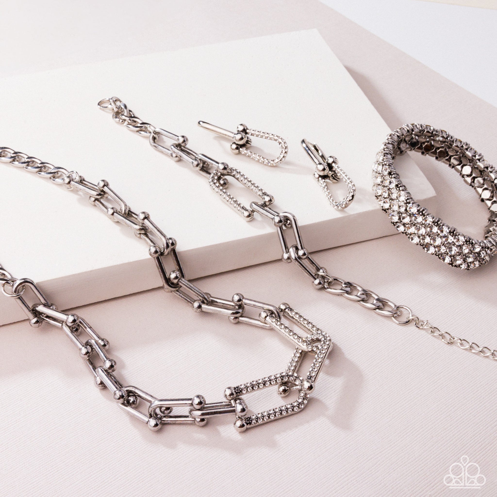 Gradually increasing in size, a shiny silver curb chain elongates into silver paperclip chain links looping around the neckline. Three of the larger shiny silver paperclip links are embellished with glistening white rhinestones for an understated shimmery finish. Features an adjustable clasp closure.