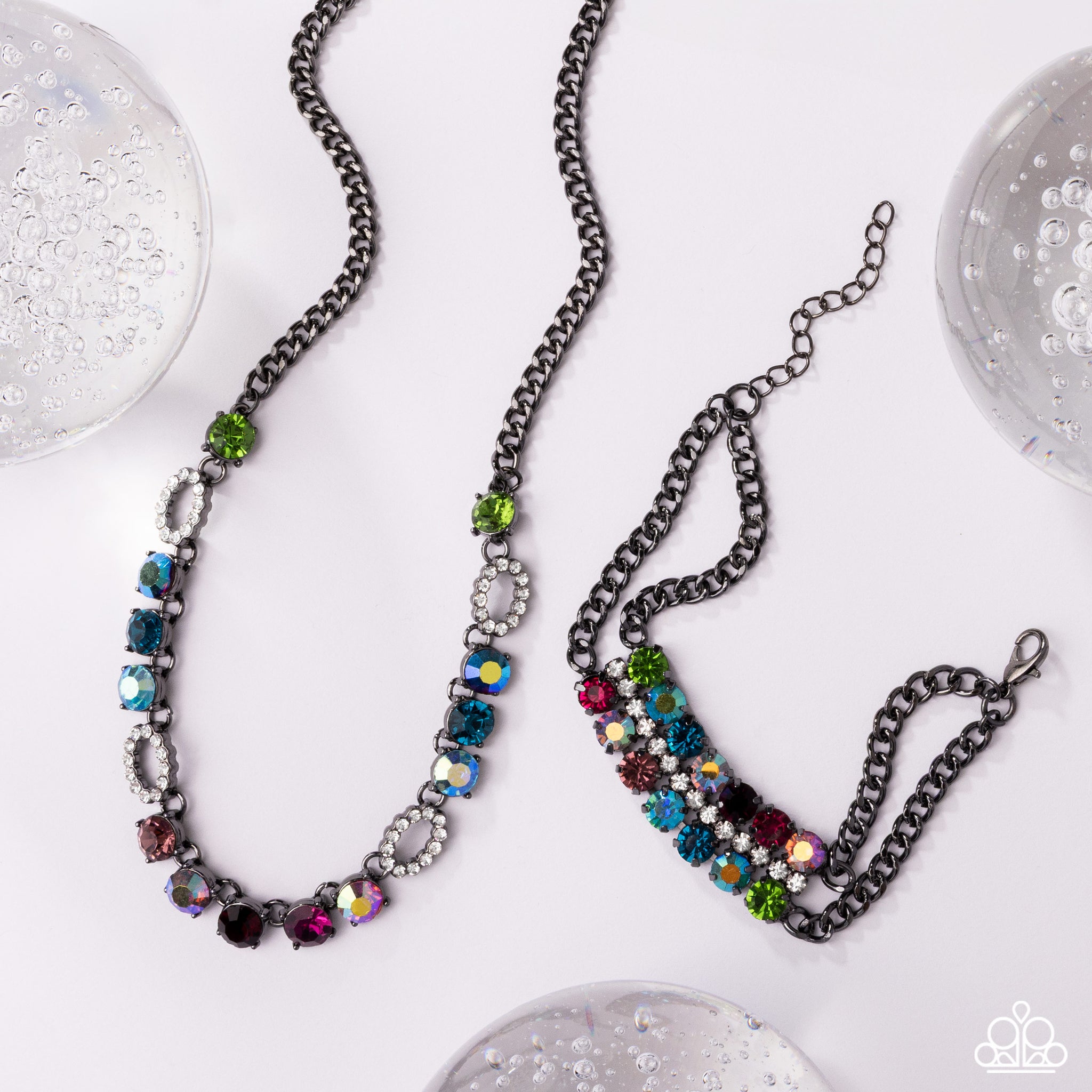 Encased in pronged gunmetal fittings, a luxurious collection of faceted, multicolored and iridescent gems joins white rhinestone-embellished gunmetal oval hoops below the collar from a classic gunmetal chain for a gritty, glamorous look. Features an adjustable clasp closure. Due to its prismatic palette, color may vary.