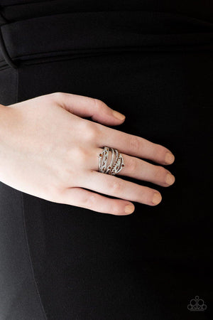 Mismatched silver bands arc across the finger, coalescing into an airy frame. Dainty rhinestones are sporadically sprinkled across the shimmery layers for a refined finish. Features a stretchy band for a flexible fit.