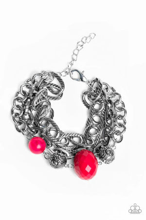 Three exaggerated rows of mismatched antiqued silver chains layer across the wrist. Infused with silver floral beads, faceted and opaque pink beads adorn one strand for a vivacious pop of color. Features an adjustable clasp closure.