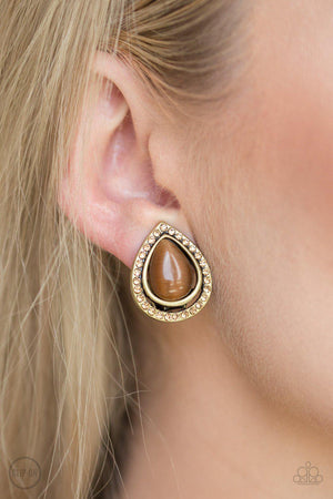 Noteworthy Shimmer Brass and Brown Moonstone Clip-on Earrings - Paparazzi Accessories