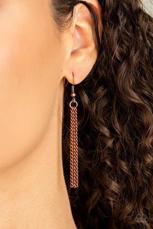 A stacked chevron-like frame swings from the bottom of a lengthened copper chain, giving way to a shimmery copper tassel for a tribal inspired look. Features an adjustable clasp closure.
