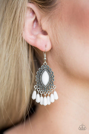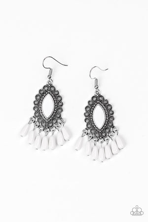 A faceted white bead is pressed into the center of a studded silver frame radiating with antiqued filigree. Matching white beads swing from the bottom of the frame, creating a whimsical fringe. Earring attaches to a standard fishhook fitting.