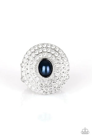 A pearly blue bead is pressed into the center of a round silver frame radiating with countless white rhinestones, creating a blinding statement piece. Features a stretchy band for a flexible fit.