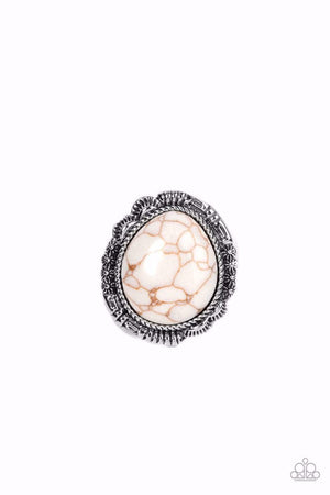 An antiqued collection of studded, scalloped, and textured silver details gathers around an asymmetrical white stone center, creating an earthy exaggeration atop the finger. Features a stretchy band for a flexible fit.