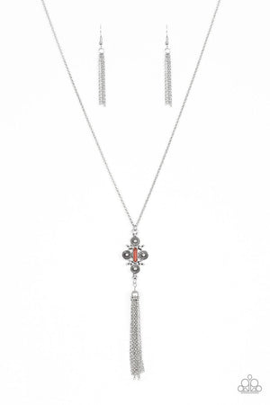 Brushed in an antiqued shimmer, abstract silver spirals coalesce into an artisan inspired pendant. Infused with a robust Chili Oil beaded center, the rustic pendant gives way to a shimmery silver tassel for a whimsical finish. Features an adjustable clasp closure.