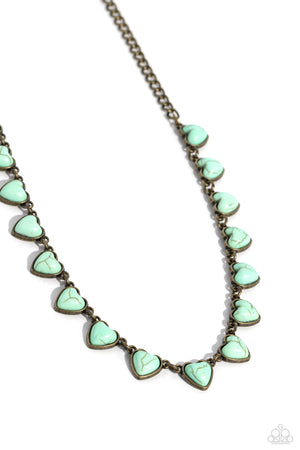 Pressed in brass fittings, light blue stone hearts delicately link below the collar, creating an earthy vintage-inspired display. Features an adjustable clasp closure. As the stone elements in this piece are natural, some color variation is normal.