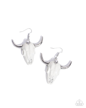 Featuring a solitaire white teardrop gem pressed in a silver fitting, a white bull skull with sleek silver horns sways below the ear for a rustic western look. Earring attaches to a standard fishhook fitting.