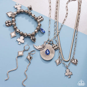 Pearl-bordered clubs, stud-and-dainty rhinestone-bordered silver spades, white rhinestone-bordered diamond-shaped pendants, textured silver clovers, and a solitaire sapphire teardrop gem swing from a collection of shiny silver beads, linear-textured silver beads, and silver beads with a dot motif. Threaded along an elastic stretchy band, the charming bracelet creates an entertaining engaging centerpiece around the wrist.