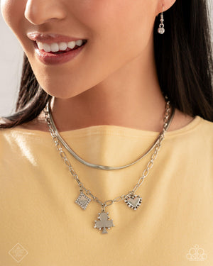A flat, silver snake chain is suspended above a silver paperclip chain, layering into a dynamic lineup of high-sheen grit. A white stud and white rhinestone-bordered heart pendant, white rhinestone-bordered diamond-shaped pendant, and white pearl-bordered club pendant sway along the silver paperclip chain for a serendipitously sentimental statement. Features an adjustable clasp closure.