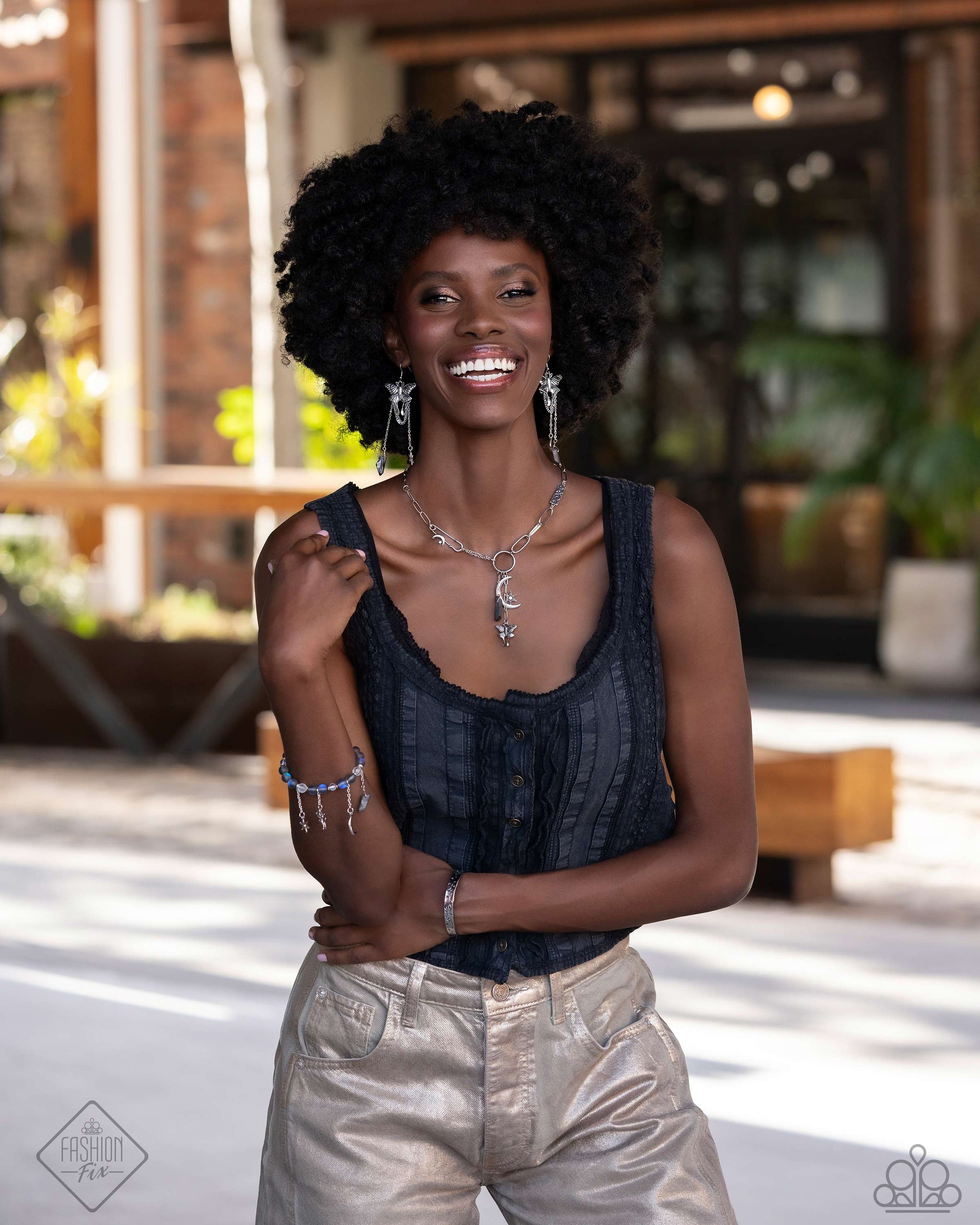 Infused along an elastic stretchy band, a collection of clear and blue-brushed hematite beads, and silver discs combine for a pop of color around the wrist. Various earthy and stellar charms drip below the display on differing lengths of silver chain including a highly-detailed silver moth, a chiseled hematite stone, a silver crescent moon, and an opalescent-centered silver star for a majestic finish.