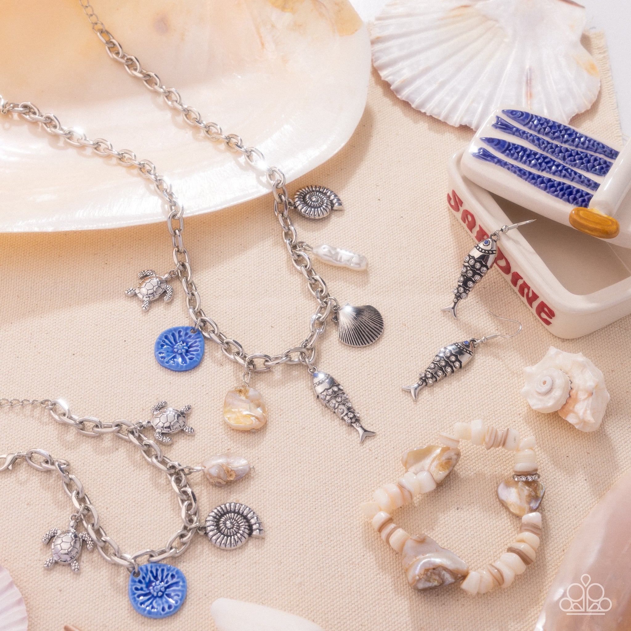 Swaying along a silver paperclip chain, a collection of coastal-inspired charms including a textured silver conch shell, a skinny baroque pearl, a silver seashell, a silver stud-detailed fish with a sapphire rhinestone eye and white rhinestone scales, an irregular oversized pearl, a blue-painted anemone-inspired disc, and a silver turtle draw attention below the neckline for an opulent oceanic display. Features an adjustable clasp closure.