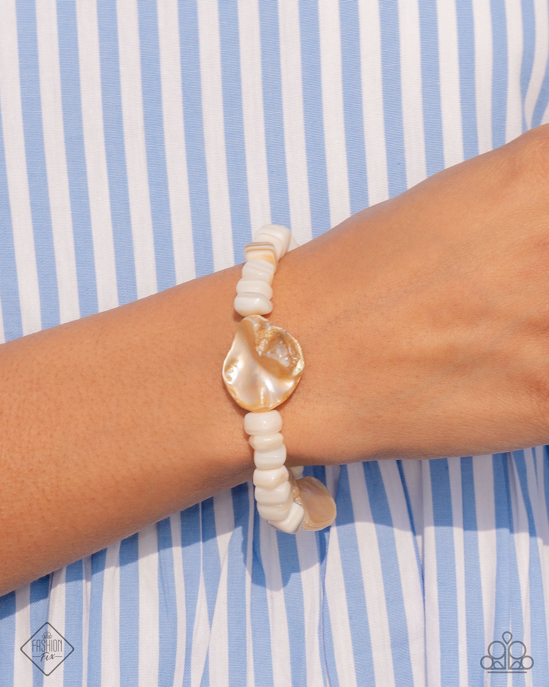 Infused along an elastic stretchy band, a collection of all-natural white shell beads are sporadically interrupted by coastal-inspired irregular oversized pearls for an oceanic opulent display. Dainty white rhinestones are pressed in a scalloped silver ring along the seashell strand for a shimmery finish.