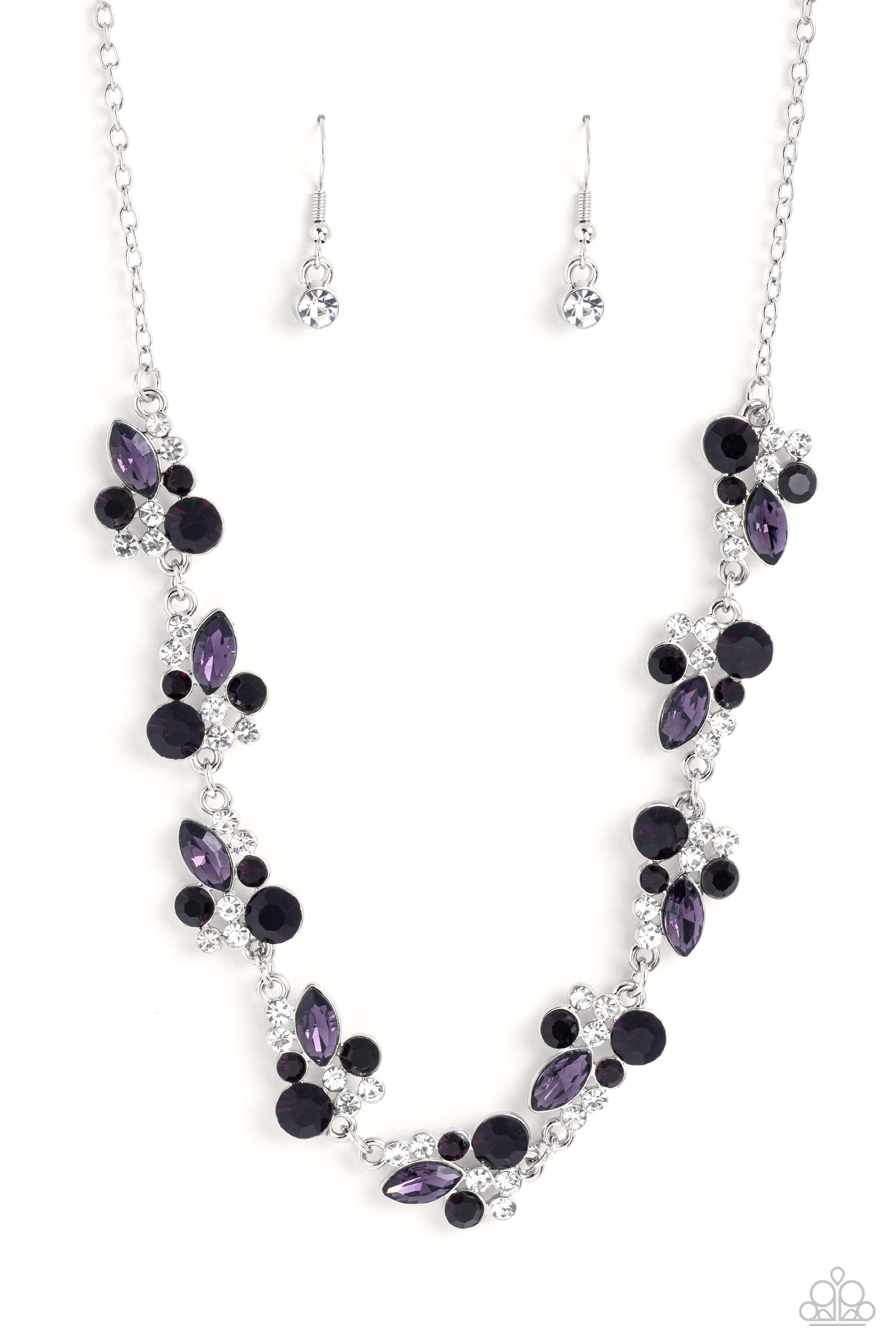 An eclectic collection of white and amethyst round rhinestones in varying sizes and marquise-cut gems in a shade of purple cluster around the collar in high-sheen silver frames. Patterned in an abstract manner, the clusters interlock together, emitting light from every faceted angle. Features an adjustable clasp closure.