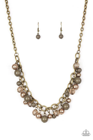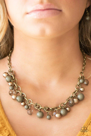 Pearly brass, polished green, and glittery crystal-like beads swing from a bold brass chain, creating a refined fringe below the collar. Features an adjustable clasp closure.