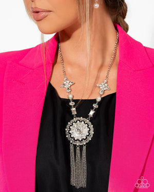 Delicately interrupting a silver cable chain, a floral pendant featuring marquise-cut and teardrop gem petals, with white pearl and white rhinestone centers joins tilted marquise-cut gems, rectangular white gems, and white half-pearls, spanning around the neckline giving way to an ornately-embellished white pearl, white gem, white rhinestone, silver filigree, and silver-studded airy floral pendant for a radiantly refined finish. A trio of classic silver chain tassels mesmerizingly sway from the pendant for an eye-catching finish. Features an adjustable clasp closure.