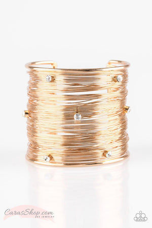 Shimmery gold wires wrap back and forth along a gold frame, creating a bold cuff. Glassy white rhinestones are sprinkled across the dramatic cuff for a glamorous finish.